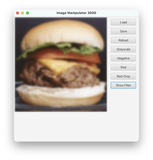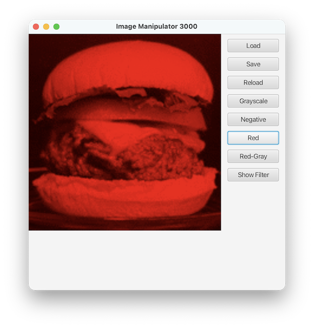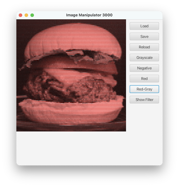 void red(ActionEvent event)— Handler for converting an image to red-channel only.void redGray(ActionEvent event)— Handler for converting an image so that every pixel on an even numbered line contains only the red color data and every pixel on an odd numbered line contains the grayscale representation of the color.void showFilter(ActionEvent event)— Handler to toggle the visibility of the Filter Kernel window. When the window is not visible, the button should display "Show Filter." When the window is visible, the button should display "Hide Filter."
