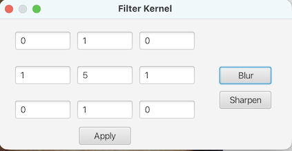 The Apply button applies whatever values are in the filter kernel to the image. At a minimum, the button need only apply the filter kernel if the sum of the filter kernel weights is a positive, non-zero value. For example, if the user enters 0 for all the filter weights, applying the filter can produce unpredictable results. The weights in the array specifying the filter kernel should sum to 1. Since the blur filter kernel has values that sum to 9 (0+1+0+1+5+1+0+1+0), each value must be divided by 9. The following code applies the Blur filter kernel: